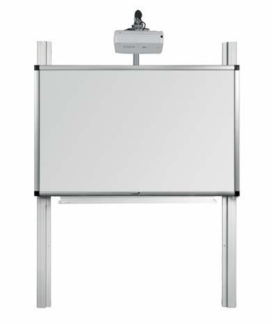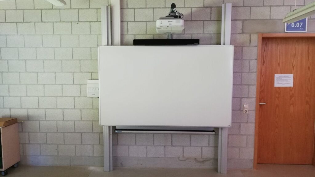 Das hybride Whiteboard (Oberfläche beschriftbar, magnethaftend UND für Projektion geeignet) ist auf einem höhenverstellbaren Pylonensystem montiert.