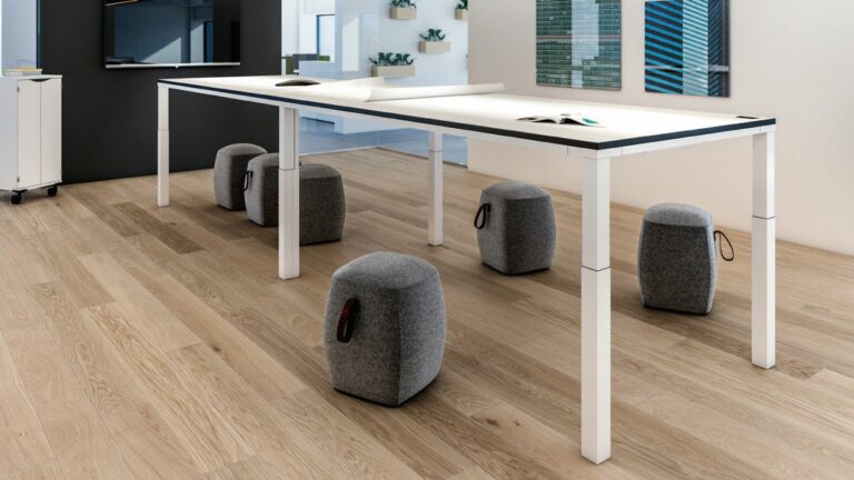 Elektromotorischer Besprechungs-tisch für eine flexible Höhen-verstellung. Fördert Konzentration und Kreativität. Bei uns „live“.