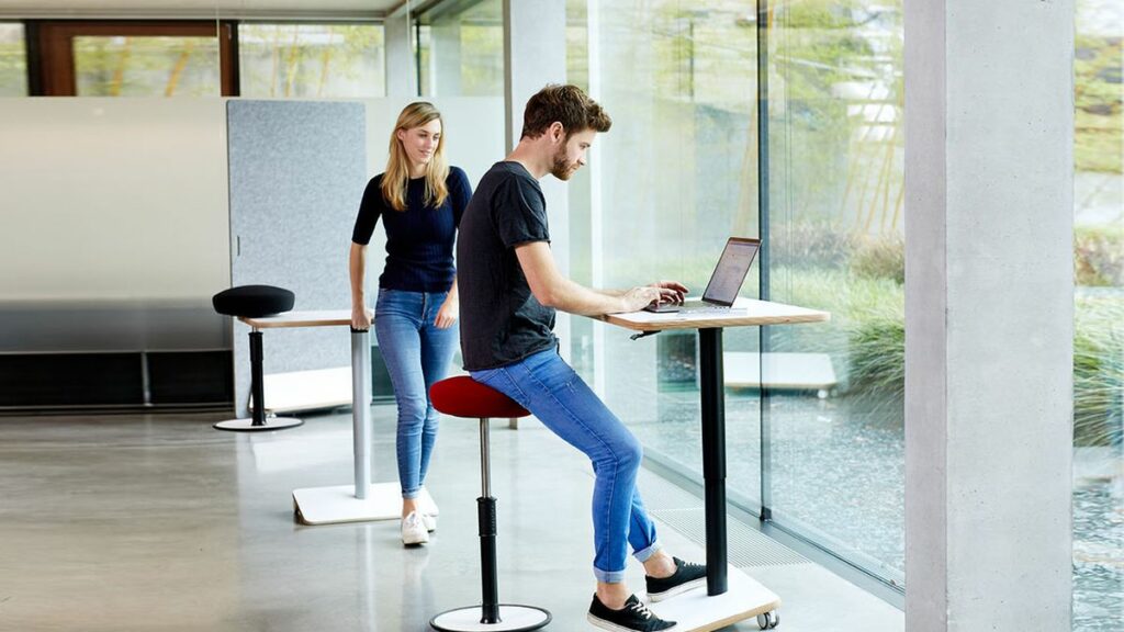Der mobilste Kollege aller Zeiten: Höhenverstellbarer Schreibitisch mit Griff und Magnet-Nut, Fußstütze mit Rollen, inkl. Sitz-Steh-Hocker.